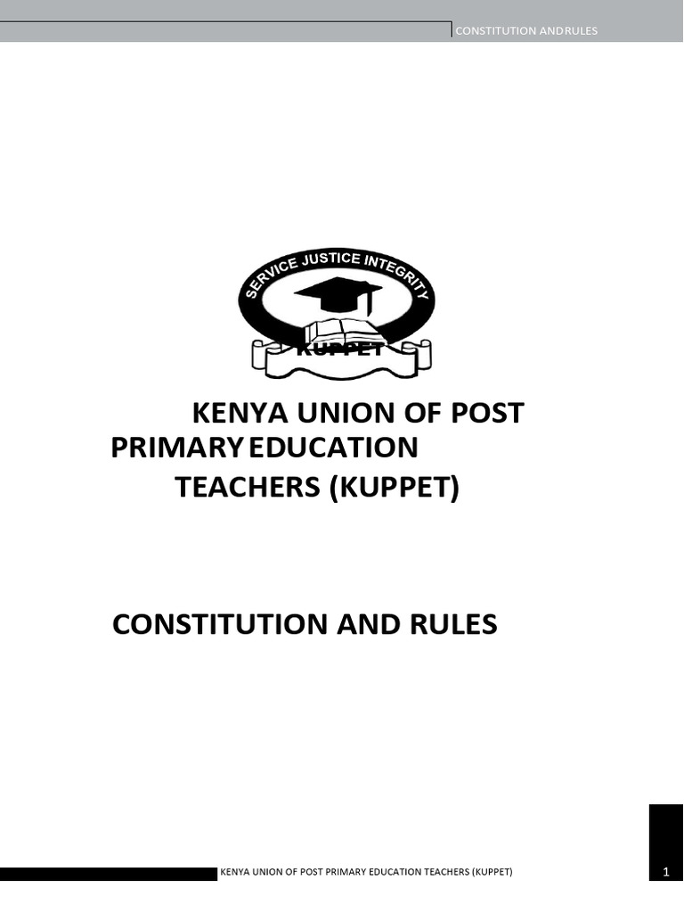 The constitution of KUPPET lays out the framework for the Union’s structure, membership, aims, and operations. It seeks to advocate for teachers’ rights, promote professionalism, and ensure fair treatment for its members. It establishes a well-defined structure including the National Executive Board (NEB), National Governing Council (NGC), Annual Delegates Conference (ADC), and branch structures. The document details the duties of union officials, election procedures, union finances, and the disciplinary process. It outlines objectives like safeguarding members’ interests, promoting quality education, and collaborating with other stakeholders locally and internationally. The constitution also provides guidelines for amendments, industrial actions, and dissolution. Throughout, it emphasizes democratic governance, gender equity, and social justice, underpinned by the union’s motto: “Service, Justice, and Solidarity.”